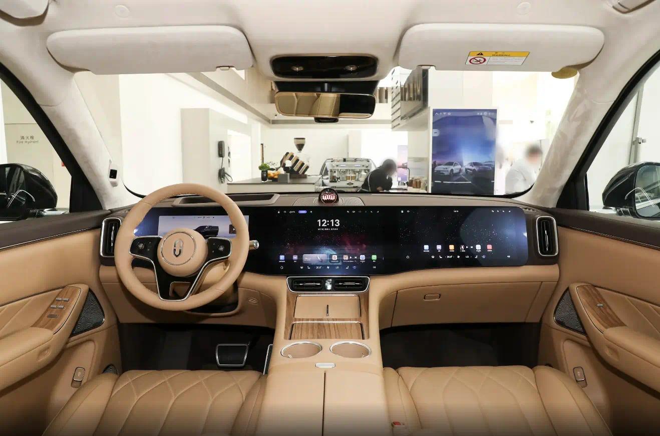 问界M8 896线激光雷达版内饰跟外观一样,没有变化,全液晶仪表的尺寸为12.3英寸,中控屏幕的尺寸为15.6英寸,副驾驶屏幕的尺寸为16英寸,HUD投影尺寸为68英寸,座椅采用Nappa真皮材质,座椅布局方式提供2+3和2+2+2,部分配置将以选装的方式提供。